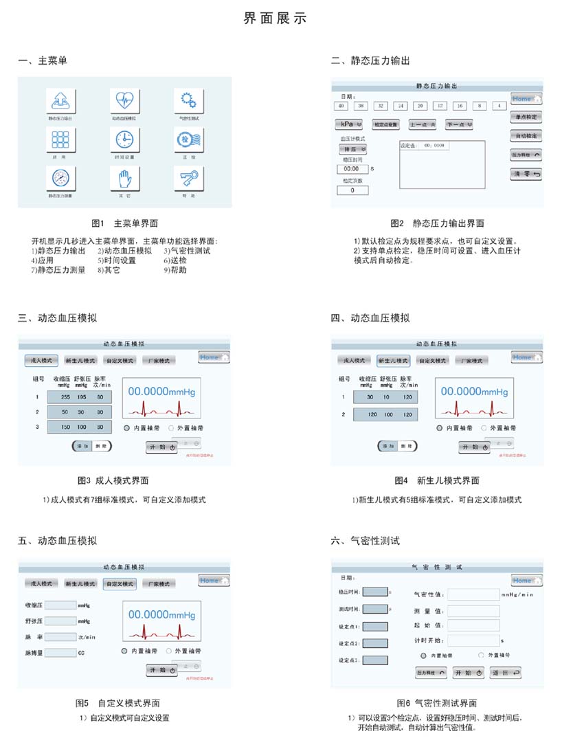 - 具備動態(tài)壓力測量、動態(tài)血壓模擬、靜態(tài)壓力測量、壓力輸出、心率、脈搏測量、觸屏功能。
