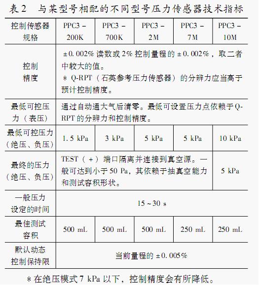 現(xiàn)在許多數(shù)字壓力計(jì)都帶有自動(dòng)控制功能,其控制原理、控制方式、控制計(jì)量性能是有很大差別的,其控制技術(shù)指標(biāo)對(duì)測(cè)量結(jié)果的影響應(yīng)引起大家的注意。在使用數(shù)字壓力控制器(帶壓力自動(dòng)控制功能的數(shù)字壓力計(jì))量傳時(shí)應(yīng)分析其自動(dòng)控制性能、技術(shù)指標(biāo)對(duì)測(cè)量結(jié)果的影響。表2是與某公司生產(chǎn)的某一系列數(shù)字壓力控制器相配的不同型號(hào)壓力控制傳感器技術(shù)指標(biāo)[2],其中有些指標(biāo)在分析評(píng)定不確定度時(shí)必須要考慮的,如默認(rèn)動(dòng)態(tài)控制保持限:當(dāng)前量程的±0.005%。這一保持限是可以改變的,改變范圍受其自身控制能力限制,不能無(wú)限降低。