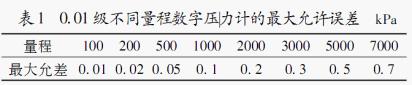 由表1可知:同為0.01級(jí)的數(shù)字壓力計(jì),量程7000kPa的最大允差是量程100kPa的數(shù)字壓力計(jì)最大允許誤差的70倍。