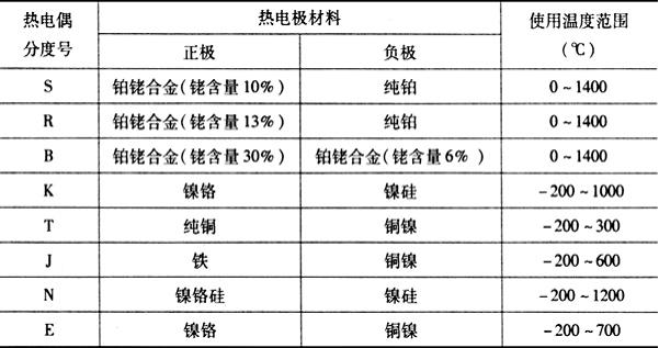 常用熱電偶可分為標(biāo)準(zhǔn)系列熱電偶和非標(biāo)準(zhǔn)系列熱電偶兩大類。所謂標(biāo)準(zhǔn)系列熱電偶是指國家標(biāo)準(zhǔn)規(guī)定了其熱電勢與溫度的關(guān)系、最大允許誤差,并有統(tǒng)一的標(biāo)準(zhǔn)分度表的熱電偶。非標(biāo)準(zhǔn)化系列熱電偶在使用范圍、數(shù)量上均不及標(biāo)準(zhǔn)化熱電偶,一般也沒有統(tǒng)一的分度表,主要用于某些特殊場合的測量。我國從1988年1月1日起,熱電偶全部按IEC國際標(biāo)準(zhǔn)生產(chǎn),并指定S、B、E、K、R、J、T、N 8種標(biāo)準(zhǔn)化熱電偶為我國統(tǒng)一設(shè)計(jì)型熱電偶。標(biāo)準(zhǔn)系列熱電偶如表1所示。