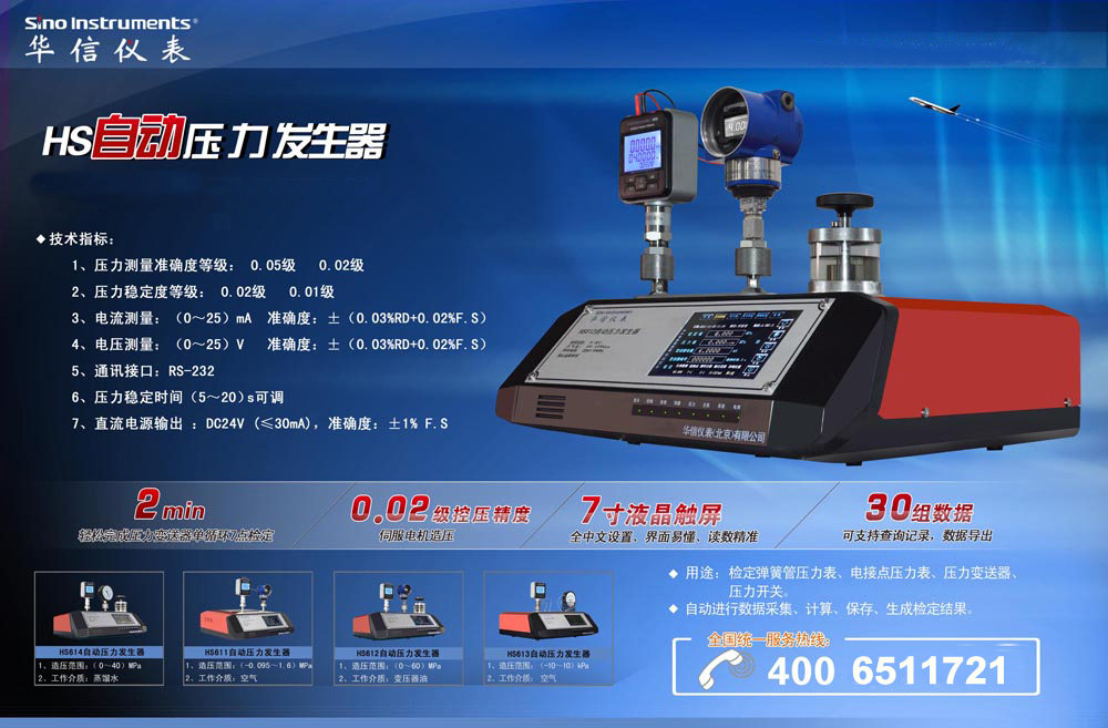 華信儀表HS自動(dòng)壓力發(fā)生器系列產(chǎn)品由多名工程師經(jīng)過數(shù)月技術(shù)攻關(guān)研發(fā)而成,具有伺服電機(jī)控壓技術(shù),真正達(dá)到了0.01%F.S的控壓穩(wěn)定度和操作自動(dòng)化。7寸真彩觸摸屏一觸即“現(xiàn)”,簡便直觀的操作直接提升了檢定效率。