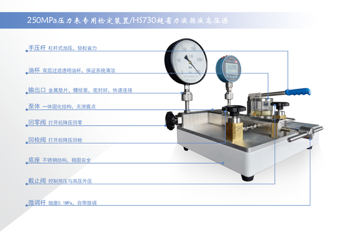 HS730高壓壓力源,通過(guò)液驅(qū)液原理實(shí)現(xiàn)250MPa壓力儀表檢定,所需用力僅等同于普通25MPa表檢定用力。采用預(yù)壓,二次加壓方式,預(yù)壓至25MPa,關(guān)閉回檢閥,通過(guò)手壓泵,輕松將壓力增值250MPa。